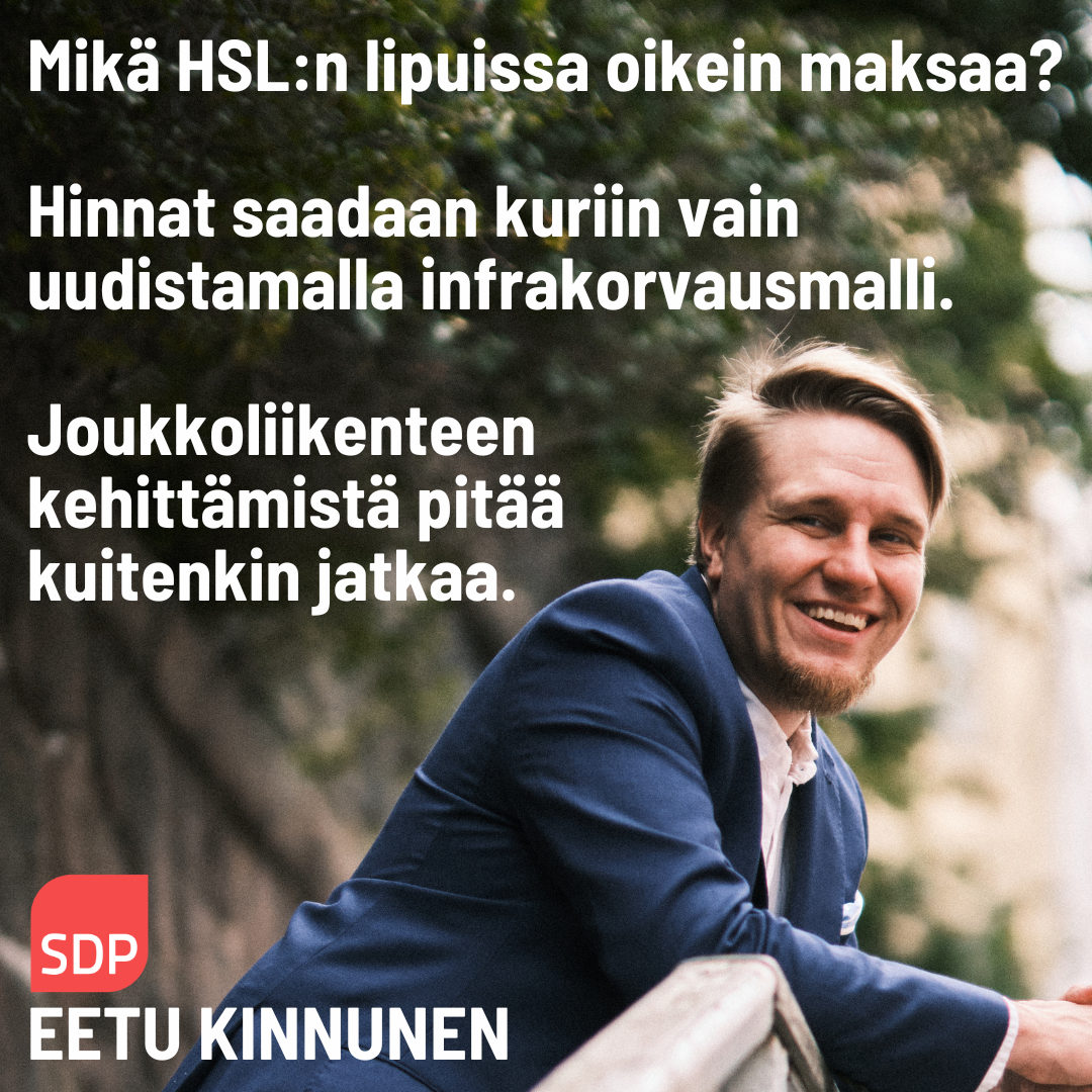 Jos Helsinki saisi yksin päättää, olisi enemmistö kaupungin päättäjistä valmis rahoittamaan joukkoliikenteen investointeja ja uudistamista enemmän verovaroista. Muut HSL-alueen kunnat eivät kuitenkaan ole yhtä valmiita kaivamaan kuvetta. Siksi meidän onkin nyt neuvoteltava muiden kuntien kanssa muun muassa infrakorvausmallin avaamisesta. Helsinkiläiset joukkoliikenteen käyttäjät rahoittavat jo nyt joukkoliikennettä kohtuuttoman paljon, onhan helsinkiläisen ostama AB-lippu lipputyypistä riippumatta kaikkein kallein suhteessa saatuun vastineeseen, kun katsotaan matkan tyypillistä kestoa, pituutta tai palvelun tuottamisesta HSL:lle aiheutuneita kustannuksia.